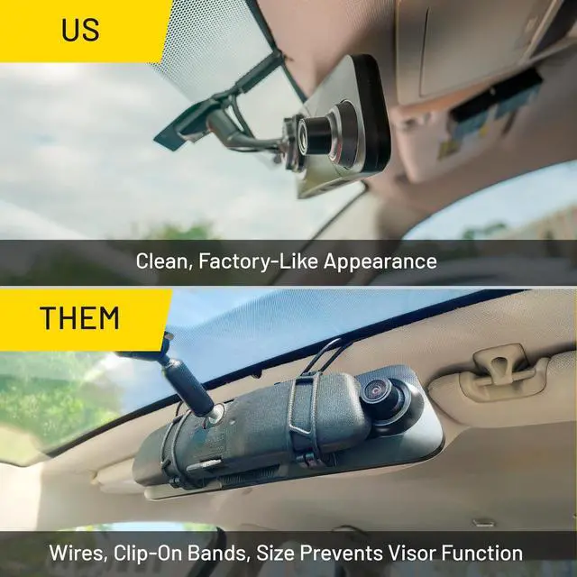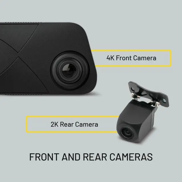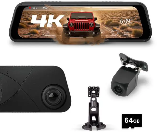 ^^: Includes a 4K front rearview mirror camera and a 2K water-resistant backup camera with night vision to capture crystal-clear driving footage, displaying every detail on the touchscreen monitor with sharp clarity. The wide 100 rear viewing angle helps improve visibility behind your vehicle in any weather condition, day or night.