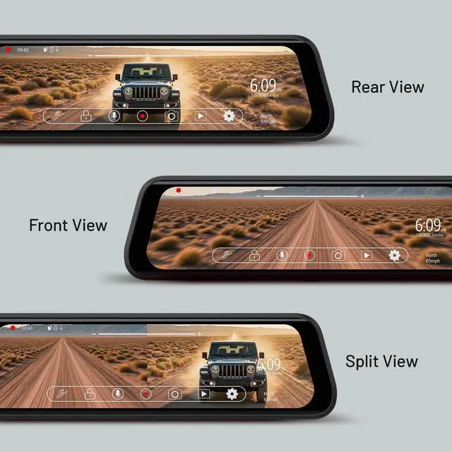 ^^: Switch between front view, rear view, split screen, or screen-off modes for specific driving situations. Ideal for parking, lane changes, or navigating tight spaces while reducing blind spots.