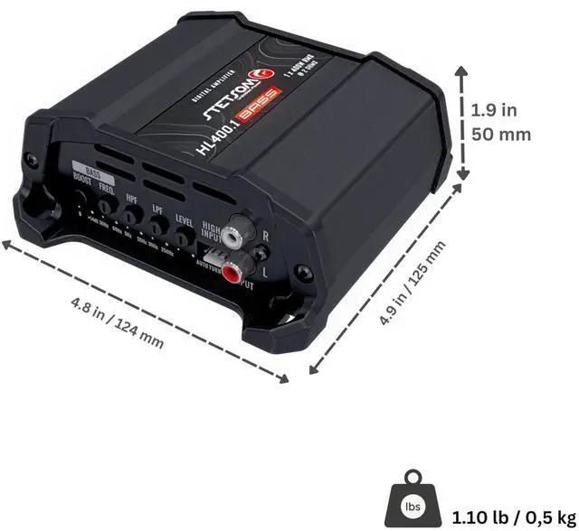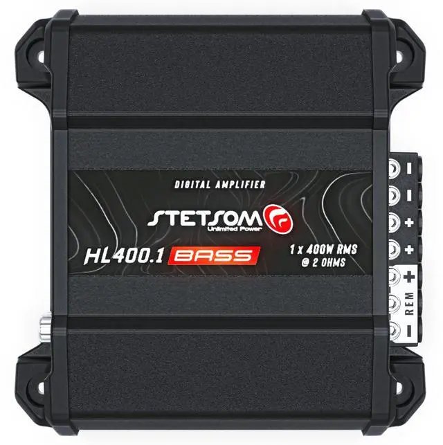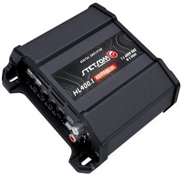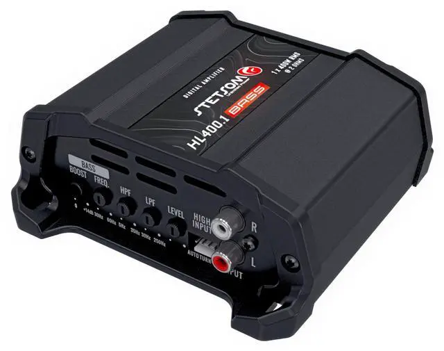 Experience powerful bass performance with the Stetsom HL 400.1 Bass Digital Amplifier. This compact powerhouse delivers 400W RMS at 2 ohms through a single channel, specifically engineered for superior bass reproduction in your vehicle's audio system. The amplifier features independent right and left channel controls, including adjustable input level settings and a versatile crossover system that lets you switch between LOW-PASS and HIGH-PASS operations to perfectly tune your sound. Its sleek black design and compact form factor make it ideal for various installation configurations, while the digital architecture ensures efficient power delivery and sound clarity.