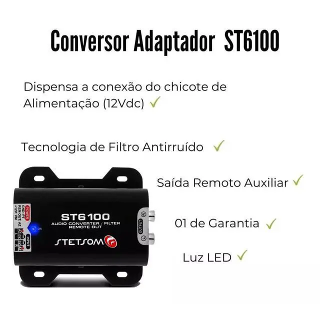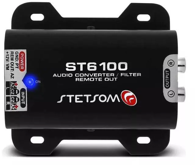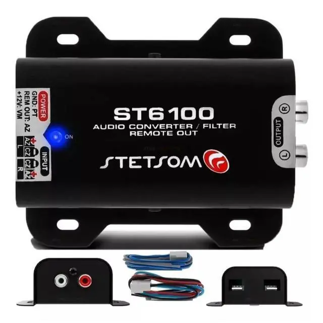 Equipment: Audio Converter (Wire to RCA), Noise Filter, and Remote Output activated by sound. ^^ The ST6100 is an audio converter from wire to RCA that also works as an anti-noise filter and provides an auxiliary remote output for original radios that don't have one ^^ The ST6100 comes with three cables. One to connect to your CD player wire, and one for power connection (negative and 12V), and a remote auxiliary output ^^ Once connected to the amplifier, the