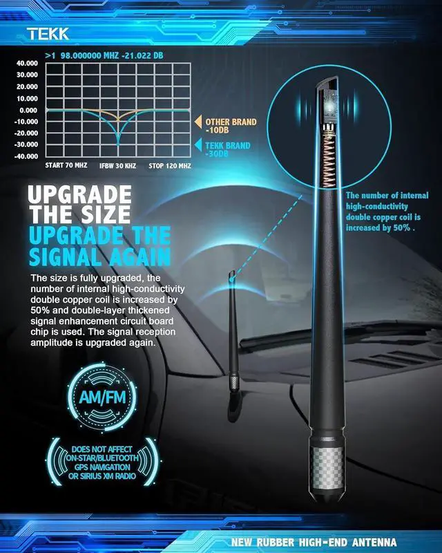 NOTE: CONFIRM YOUR VEHICLE IN THE DROP DOWN BOX ABOVE TO ENSURE FITMENT ^^ UNMATCHED AM/FM RECEPTION ^^ TEKK Sturdy rubber antenna for superior AM/FM reception. Picks up AM/FM signals in the city with minimum skipping. Moreover, it doesn't interfere with your navigation systems, or XM radio, or any satellite service of that sort. So, you can get a short antenna without having to worry about affecting other performances ^^ SUPERIOR FLEXIBLE MATERIAL ^^ Strong carbon fiber bottom ensures no loss of signal. Its carbon fiber bottom keeps the antenna securely latched to the existing antenna mount no matter what. Premium rubber construction for enhanced weather resistance, can withstand high temperatures in summer. No tools are needed to install the antenna. It takes only a minute to install ^^ CAR WASH PROOF ^^ TEKK flexible 7 9/10" high rubber antenna is carwash-best. Optimized short antenna replacement maintains a low profile. Instead of a towering stock antenna, a short is comparatively a lot better to look at, and it elevates the visual aesthetics of your ride ^^ PROMISED PRODUCT QUALITY ^^ TEKK antenna is flexible and can comfortably tilt side to side without any damage incurred to the antenna base or connection point.