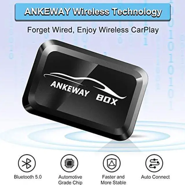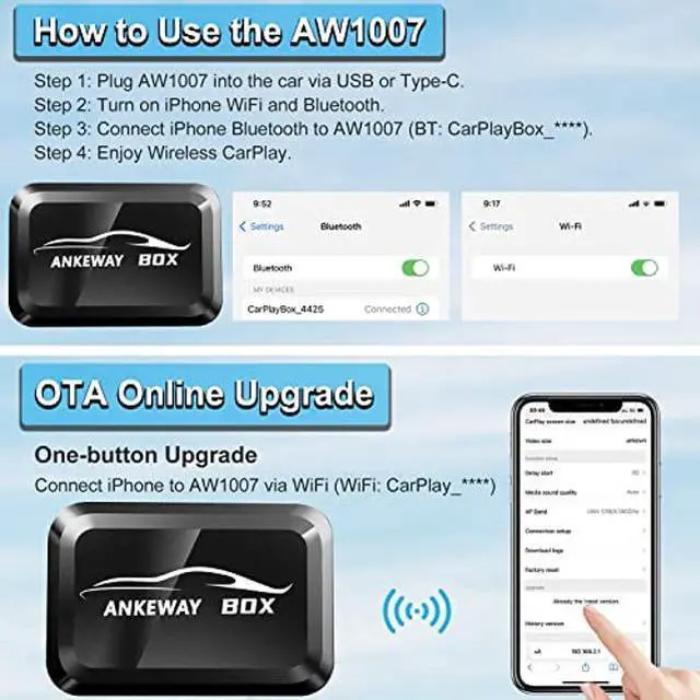 [(Fastest Speed/Plug & Play/Auto-Connect/No Delay/Online Update)] 2022 the latest upgraded version of ANKEWAY BOX takes less than 5 seconds to pair your car and iPhone. Plug the box into the same jack you normally use to connect your iPhone to Carplay, then connect your iPhone Bluetooth with ANKEWAY BOX to enjoy the no-delay wireless CarPlay. Once set up the first time, it will auto-connect after that. It supports OTA online upgrades.