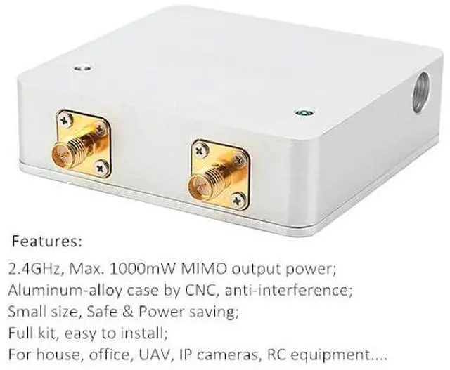 Low noise receives gain. Signal activity LED indicates. High Gain, High Value, High Performance. 2.4GHz, Max. 1000mW (30dBm) output power; Aluminum-alloy case by CNC, anti-interference; Small size, Safe and Power saving; Full kit, easy to install; For house, office, UAV, IP cameras, RC equipment