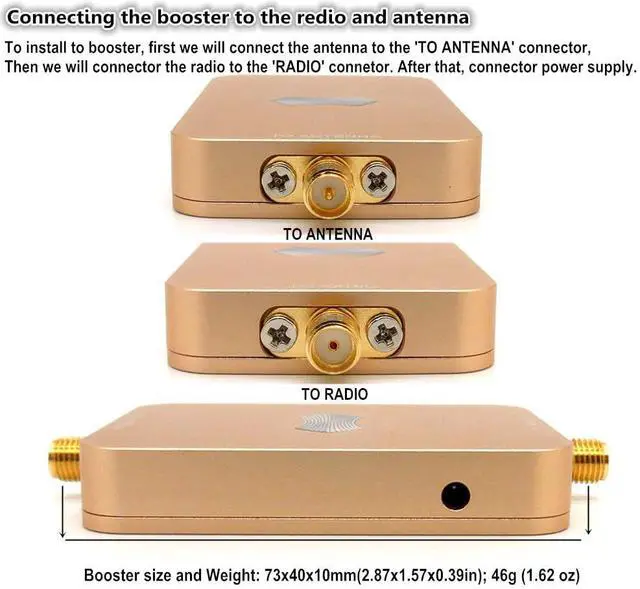 Light weight: the WiFi signal booster have the feature of light weight (46g) and small size: (73 x 40 x 10mm) can easy install in DJI drones, XIRO UAV, RC remote to extend wifi signal range and the flying distance of drones. Simply plug and play, no software is required ^^ 5.8GH z Signal booster coverage range and usage: Drone signal booster output power is 2000mW (33dBm),