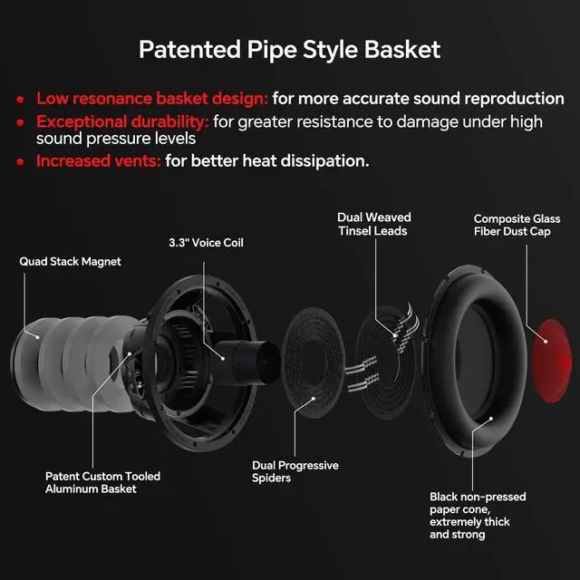 ^^ ALUMINUM BASKET: The TXX-BDC-IV-15's newly designed powdered black paint aluminum basket with a composite glass fiber dust cap, and a newly refreshed and strongly constructed dust-proof heat sink was engineered to deliver optimal sound quality. ^^