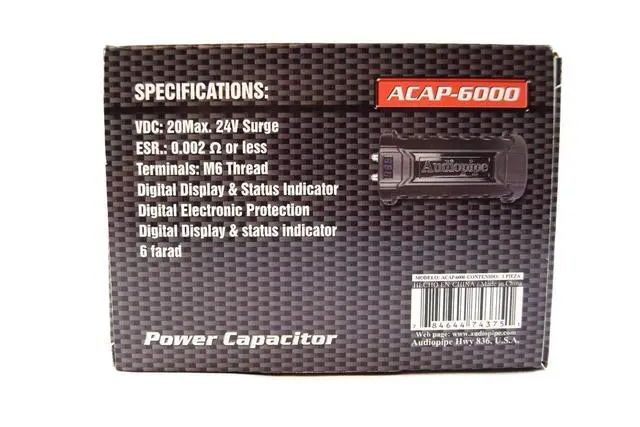 Description:? Vcd: 20Max 24V Surge Esr: 0.002O Or Less Terminals: M6 Thread Digital Display & Status Indicator Digital Electronic Protection Digital Display & Status Indicator 1 Year Audiopipe Warranty