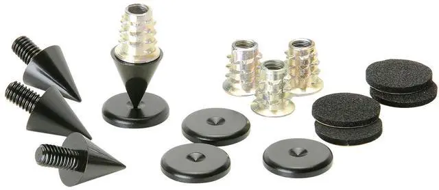 Dramatically improves clarity, stereo imaging, and bass response_Great results when used with subwoofer systems_Solid brass construction with attractive plated finish_Two-piece tip design for level adjustment_Barbed inserts can be mounted from inside or outside the cabinet