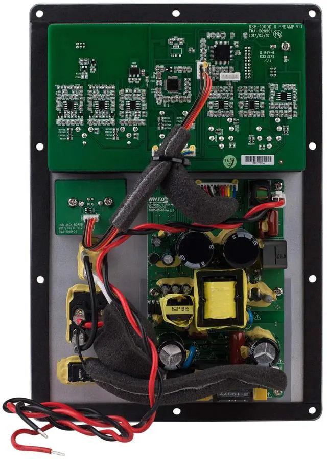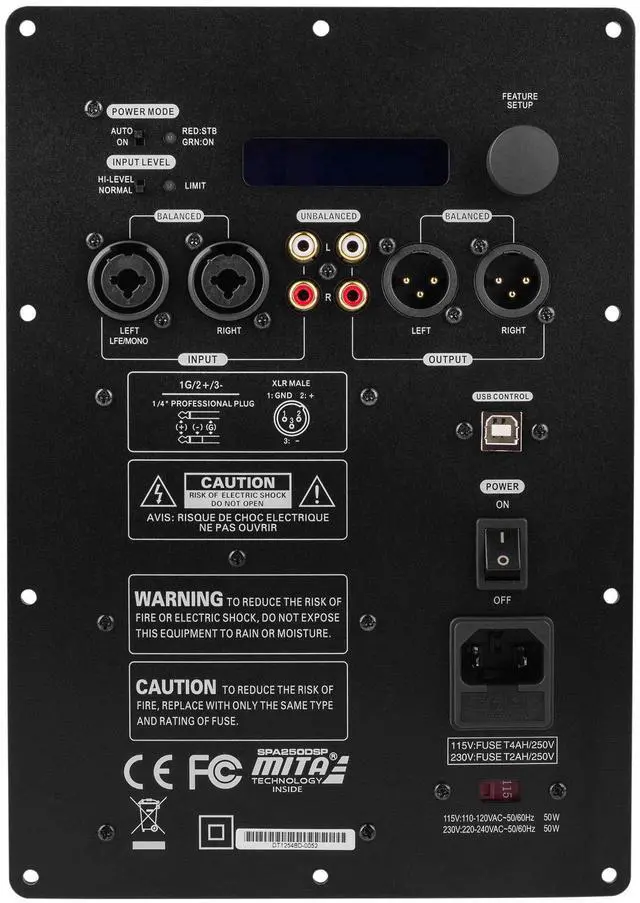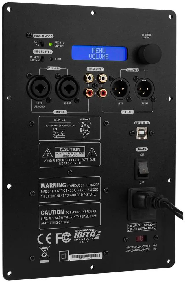 DSP functions include: 7 PEQ bands, LPF, phase, subsonic filter, limiter, mains delay, and HPF ^^ Single-knob control panel with high-contrast LCD display and status LEDs ^^ Fast, intuitive PC-based GUI software enables full access to the DSP functions ^^ Efficient Class D output topology ensures high-impact low frequency performance ^^ Includes both balanced and unbalance line level inputs and outputs