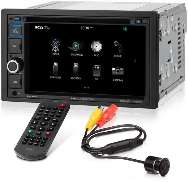 Ramp up your music choices on your next road trip with the Boss Audio BVB9364RC DVD Player and 6.2" Touchscreen Monitor. Slide in a DVD or CD, plug into the SD and USB ports or hook up your smartphone to the Auxiliary input to listen to your playlists. Bluetooth technology lets you stream music apps like Pandora and Spotify and make calls hands-free. Reverse with confidence in tight spots with the included rear-view camera. Change up the sound style with the Preset EQ. Make easy adjustments with the wireless remote, existing steering wheel controls (interface required, not included) and touchscreen monitor.