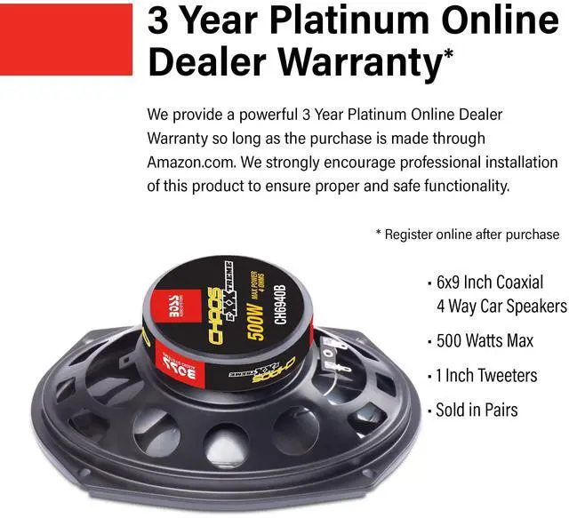 Sensitivity: 92 dB @ 1 watt/1 meter ^^ Poly Injection Cone, Rubber Surround, Stamped Basket, 1.25 Inch Voice Coil ^^ 1 Inch Polyimide Tweeter + 0.5 Inch Piezo, 2.5 Inch Polyimide Cone Midrange ^^ BOSS Audio Systems provides a powerful 3-year platinum online dealer warranty so long as the purchase is made through. We strongly encourage professional installation of this product to ensure proper and safe functionality