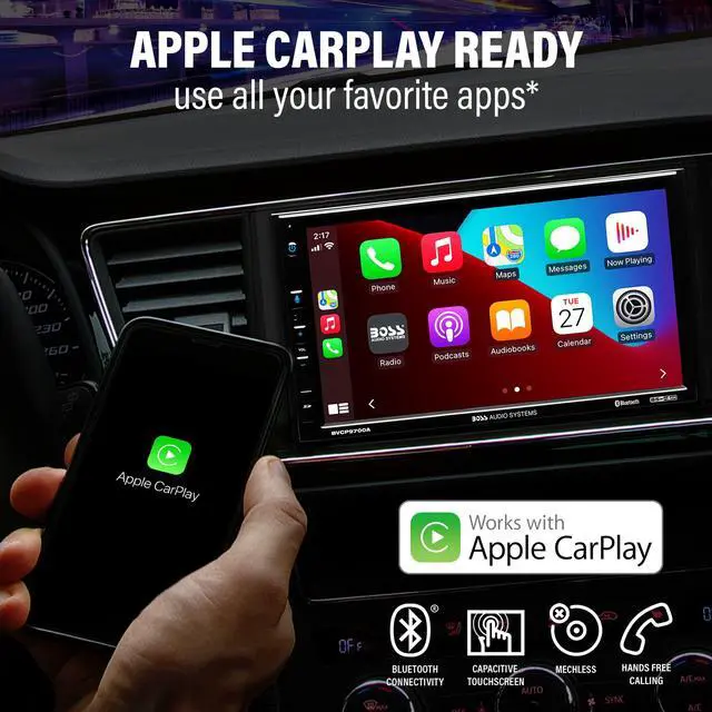 Apple CarPlay - Access icons on your iPhone by activating Siri voice controls the touchscreen. Available features include Phone, Music, Maps, Text messages, Radio, Podcasts, Audiobooks