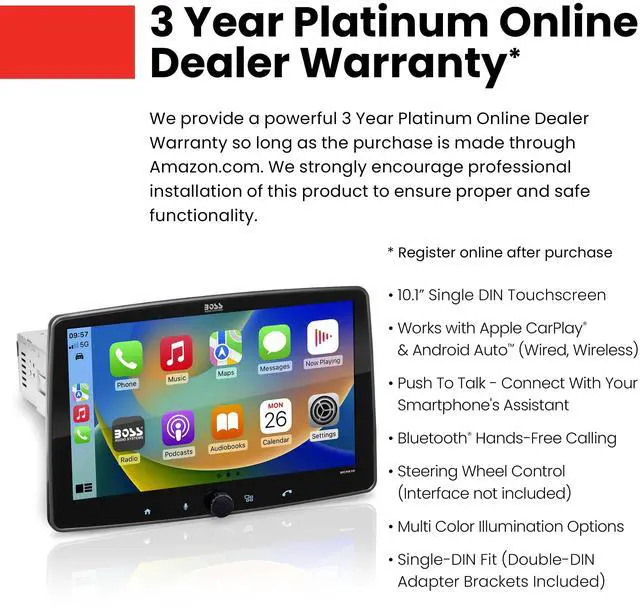 WARRANTY: BOSS Audio Systems provides a powerful 3-year platinum online dealer warranty. We strongly encourage professional installation of this product to ensure proper and safe functionality
