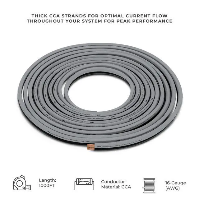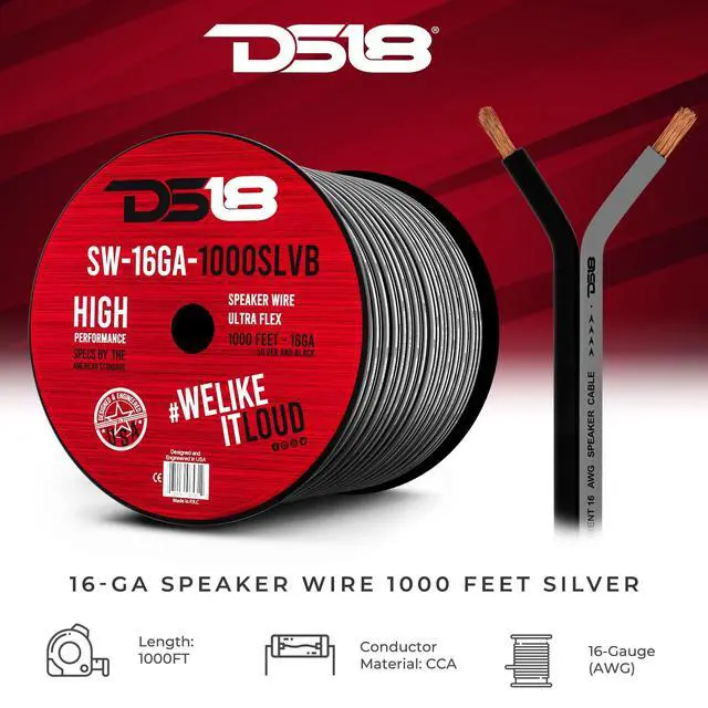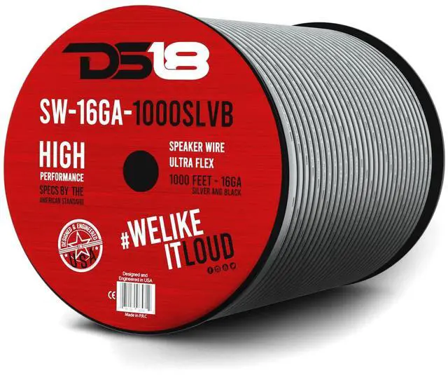 DS18 SW-16GA-500SLVB 16-GA Ultra Flex Speaker Wire Silver and Black 500FT - Speaker Cable for Audio ApplicationsDS18 provides the perfect combination of affordability and quality, this speaker wire is a tremendous value and a great solution for the everyday audiophile. Making the connections to your Speakers and Subwoofers with high quality cable is an extremely important part to making sure the system runs at peak performance. This 16-Gauge Speaker Wire will will do just that, featuring thick CCA strands for optimal current flow throughout your system for peak performance.