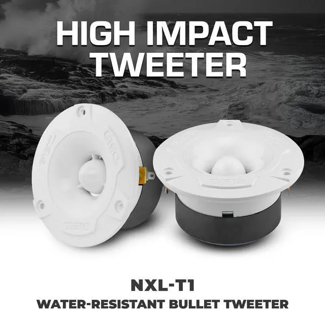 DS18 NXL-T1 Marine 1 VC Waterproof Aluminum Bullet Tweeter 240W Max, 4 Ohms, Built in Crossover - Great for Boats, Motorsports, Motorcycle ATV UTV (2 Water Resistant Speakers) ^^^^ WATERPROOF TWEETERS - 100% waterproof construction so water or moisture cannot cause damage or corrosion ^^^^ PROFESSIONAL GRADE SUPER TWEETERS - This tweeter is designed to bring amazing clear highs while not leaving any of the inner working exposed so they will not be damaged by corrosion or water ^^^^ ALL ELEMENTS - These tweeters are perfect for exposed 4x4, marine, and motorcycle applications for worry free sound ^^^^ TOP OF THE LINE TWEETERS - Professional grade super tweeters that can handle high frequencies with ease.