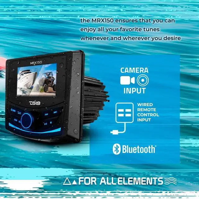 MARINE & POWERSPORT HEAD UNIT - Your Marine and Powersports vehicle will never be the same when you install DS18s new MRX150! Is the perfect way to take control of the audio reproduced by your Marine and Powersports Audio System! ^^ INVALUABLE FEATURES - Tons of invaluable attributes have been added to this head units repertoire so users can play all of their favorite songs whenever they want: AM/FM/WB Tuner with 37 different presets (18FM / 12AM / 7 WB), Bluetooth v 5.0 for superior audio streaming, USB Port, and AUX. Silicone Cover Included ^^ WEATHERPROOF - The MRX150 is built to withstand the elements with support from its Gorilla Glass Screen with OCA Full Bonding. The incorporation of these parts helped boost the MRX150 to an impressive Waterproof Rating of IPx6, protecting it against high pressure water streams from any angle. The MRX150 is also protected against damage caused from UV rays and corrosion from salt. Silicone Cover Included. ^^ CUSTOMIZABLE & DYNAMIC - The MRX150 also uses a 2-Band equalizer for complete control over two parts of your frequency spectrum (Bass and Treble). Take even more control over the audio in your vehicle by sectioning off your audio into 2 Zones with Independent Level and Tone Control ^^ HIGH POWERED & RELIABLE - At 2 ohms this unit offers 4CH x 25W Continuous Power Output and 4CH x 50W Max Power Output which is generally enough to power all entry level speakers. The PRE-AMP outputs will deliver a maximum of 4 volts for all 7 channels so your amplifiers get the clearest sound available.