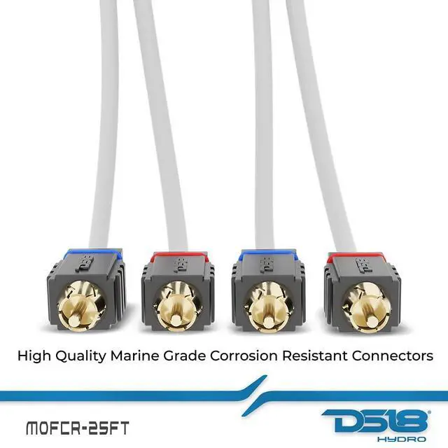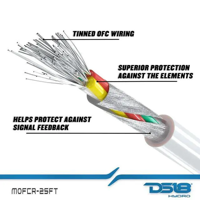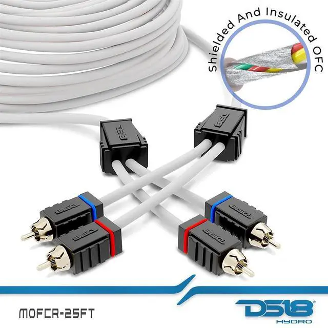 Marine Tinned OFC 25 Feet RCA Out in the elements you want the best protection for your signal. DS18 offers high quality UV and corrosion resistant wire that will give you the highest signal transfer for your amps. This increases overall loudness and sound quality by having very little voltage loss because of the high quality OFC construction. These RCAs will be sure to last you a very long time, even exposed to the elements and bring you loud and clear sound with high noise rejection for great sound quality. Type 2 Channels Marine RCA Cable Size / Length 25FT Conductor Material Tinned OFC Cable Construction type Twisted pair for 2 channels RCA Plug Material Metal with Injected PVC Body Shield Type Material UV Resistance PVC Protection
