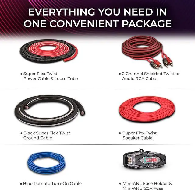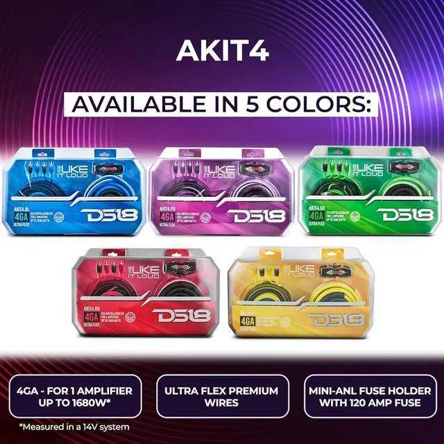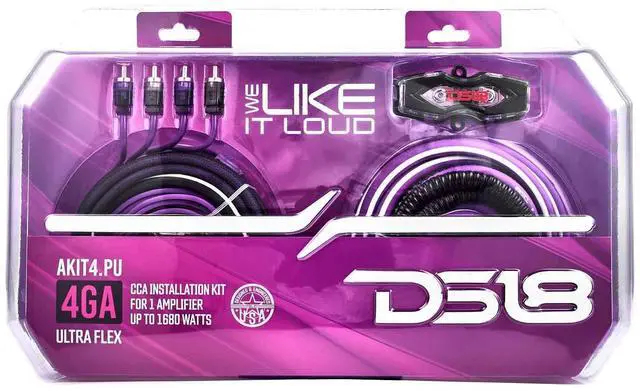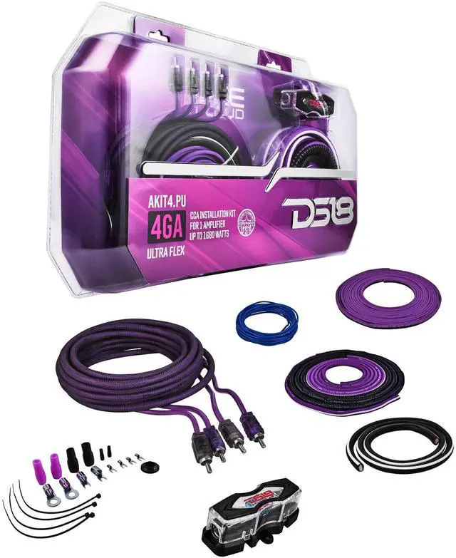 Complete Installation Kit - The DS18 AKIT4 provides everything you need for a seamless and professional amplifier installation, from high-quality cables to essential accessories, saving you time and effort ^^ High Power Handling - Capable of supporting amplifiers with up to 1680 watts of power, the AKIT4 ensures your audio system performs at its peak ^^ Superior Quality Components - Featuring true gauge wires, heavy-duty hardware, and shielded RCA cables, this kit guarantees longevity and exceptional sound quality ^^ Enhanced Safety - With a Mini-ANL Fuse Holder and a 120A fuse, the AKIT4 offers robust circuit protection to keep your audio system safe ^^ Flexible and Easy to Install - The 17 feet of super flex-twist power and speaker cables, along with various terminals and cable ties, make the installation process straightforward and adaptable to your setup