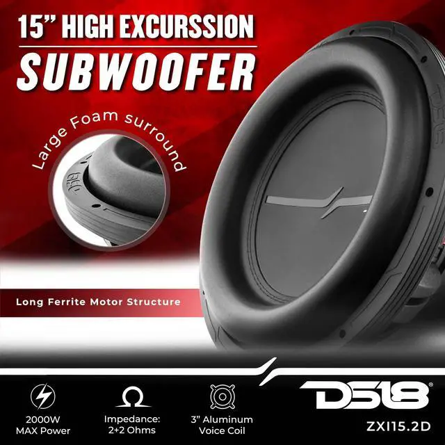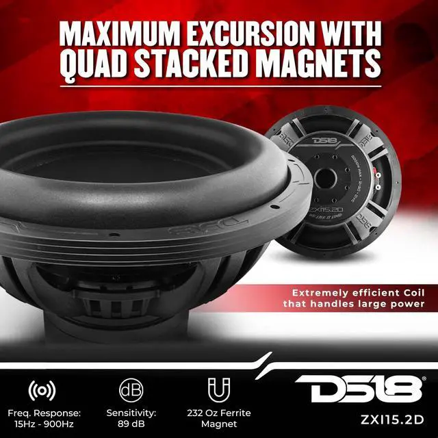 Powerful Bass! The majority of subs that produce this much bass usually have enormous power requirements to get to maximum XMAX and deliver crazy loud bass. The ZXI 15.2D sets itself apart since it has an extremely efficient coil that handles large power with a higher dB rating than most subs at 89 dB. This sub is also conservatively rated at 1000W RMS Power Handling and 2000W MAX Power Handling, making it capable of handling anything you throw at it! Product Highlights Long ferrite motor structure allows for maximum excursion and former clearance with quad stacked magnets.