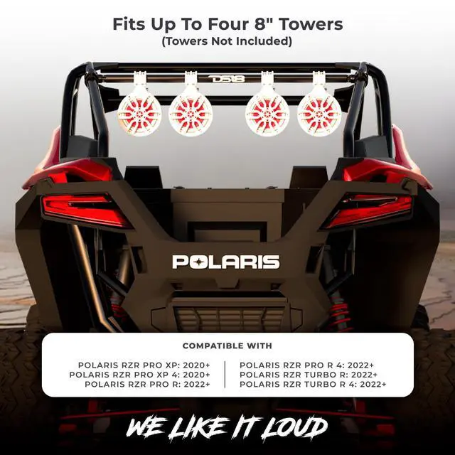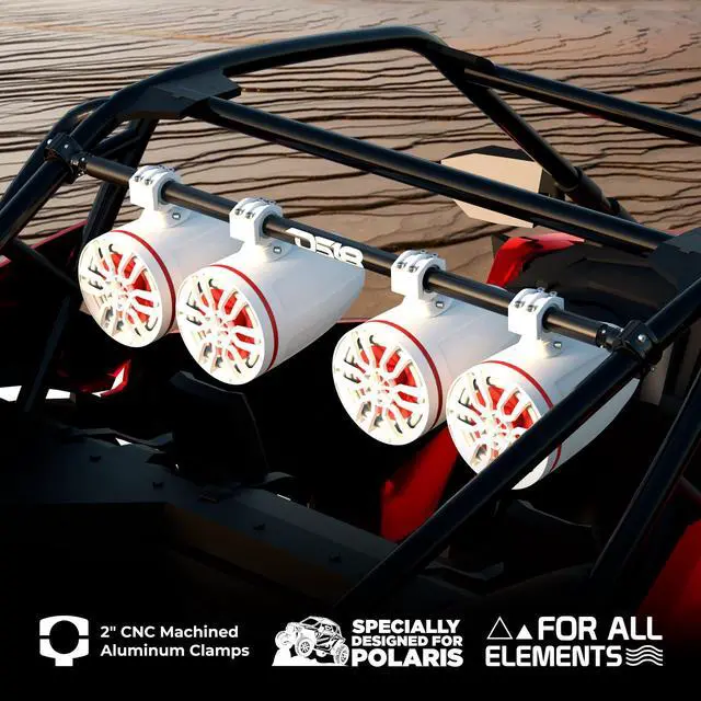 Ultimate Audio Upgrade - Securely mount up to 4 tower speakers with confidence on your Polaris RZR, ensuring a premium audio experience, even on rough terrain ^^ Heavy-Duty Build - Crafted with a robust 2" steel tube and 2" CNC-machined aluminum clamps for unmatched durability and long-lasting performance in any condition ^^ Flexible Installation - Adjustable mounting range from 35.6" to 37.5" (905mm-950mm) gives you full control over speaker placement for optimal sound delivery ^^ Versatile Wiring Options - Easily accommodate buried or open wire setups, giving you more customization possibilities ^^ Sleek & Weather-Resistant - The UV-compliant gloss black finish adds style while offering protection from harsh weather and sunlight for long-term use