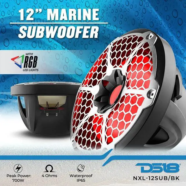 More cone area! More power handling! More frequency ranges! This is what the Glossy Black DS18 Hydro All Elements 12-In. 700-Watt-Max SVC Marine Subwoofer with Integrated RGB LEDs brings to the table. This waterproof subwoofer is the sub to have because it will perform in all scenarios. It's designed and mainly optimized for use in ported and sealed enclosures, but with the correct baffles, it can also be used as a free air sub. The marine subwoofer is IP65 waterproof rated and will take more environmental abuse than a standard sub.