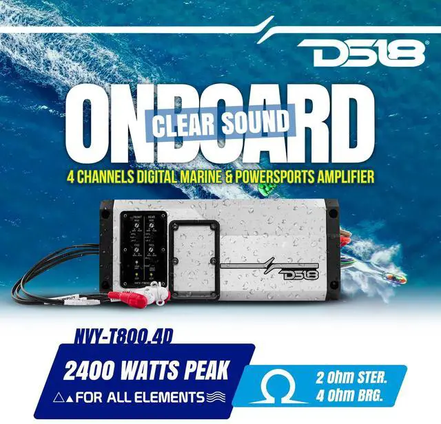 UNMATCHED DURABILITY - With its IPX6 waterproof rating and UV/SALT/Fog protection, the DS18 NVY-T 800.4D is designed to withstand the harshest elements, making it perfect for marine and powersports audio applications ^^ CUSTOMIZABLE SOUND - The selectable high-pass, low-pass, and flat crossover filters allow you to customize the sound to your liking, ensuring crisp and clear audio with minimal distortion ^^ HIGH POWER OUTPUT - With a peak power output of 2400W and RMS power of 4 x 200W @ 4 ohm, 4 x 300W @ 2 ohm, and 2 x 600W @ 4 ohm bridge, the NVY-T 800.4D provides plenty of power to drive any speakers in your system ^^ WIDE RANGE OF PROTECTION FEATURES - The NVY-T 800.4D is equipped with a variety of protection features, including thermal protection, over-load protection, short circuit output protection, and voltage input protection, ensuring the safety and longevity of your system ^^ EASY INSTALLATION - The direct harness design and surface mount component technology make installation of the NVY-T 800.4D a breeze, without sacrificing space in your boat or powersports vehicle