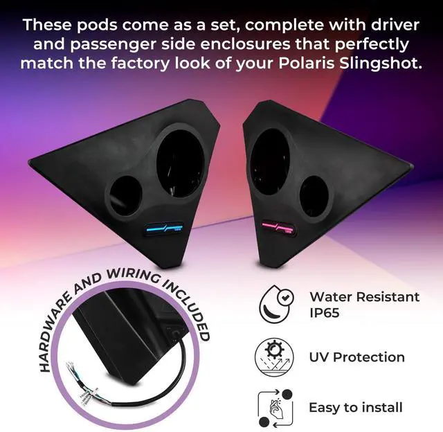 Easy Installation - With included installation hardware and OFC tinned wiring, these pods utilize your Slingshot's factory bolts for a perfect fit, allowing you to spend less time installing and more time enjoying your upgraded sound system