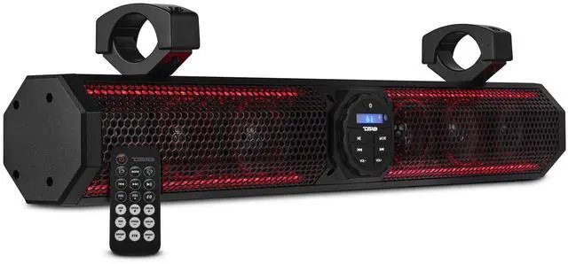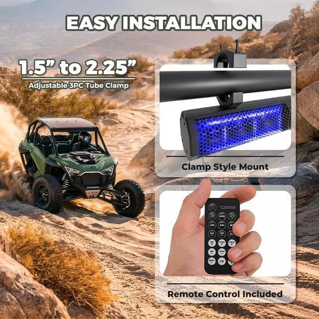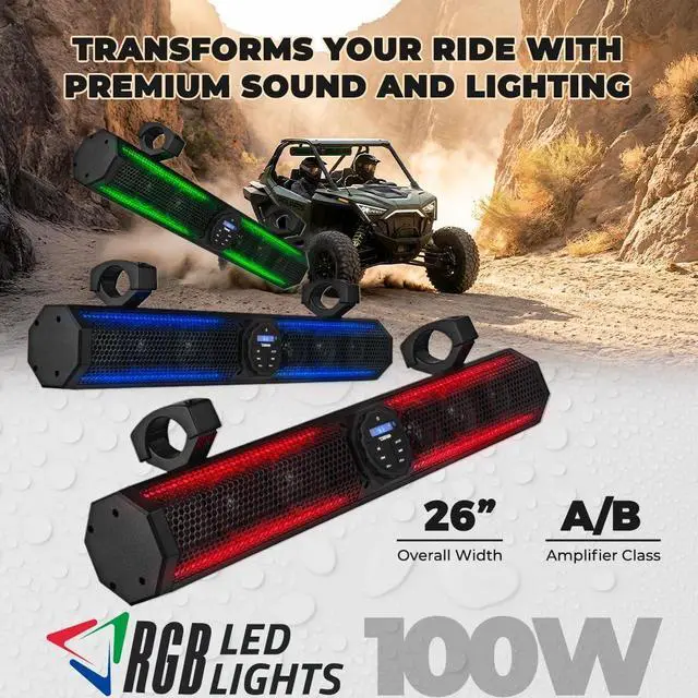 Customize your listening experience with five EQ presets and take full control with the rotating panel and included IR remote ^^ Aesthetic Appeal with Adjustable Lighting - Illuminate your setup with blue backlit and RGB LED lights, adding a stylish and dynamic ambiance to your marine or outdoor settings ^^ Easy Installation and Adaptability - The soundbars clamp-style mount adjusts from 1.5" to 2.25", making it easy to install on various surfaces, while its compact 26" design and 33 ft. Bluetooth range provide convenience and flexibility for any adventure