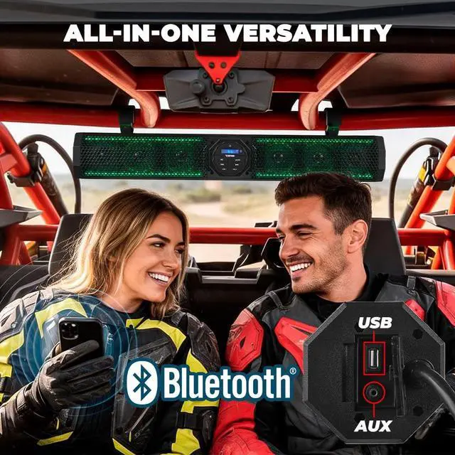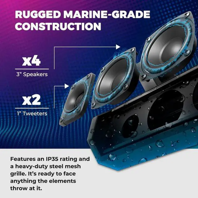 Powerful Audio Performance - Experience a robust 600W peak and 100W RMS power output with Class A/B amplification. Enjoy clear, immersive sound from its six speakers, featuring four 3" woofers and two 0.94" tweeters ^^ Unmatched Durability for Harsh Environments - With a marine-grade IP35 rating, oxidized black hemp sand finish, and steel mesh grill, the DS18 SB26BTXRGB soundbar is built to withstand outdoor conditions, ensuring longevity and reliability during your adventures ^^ Versatile Connectivity and Control - Stream your favorite music wirelessly with Bluetooth V 5.0 or connect via USB and AUX.