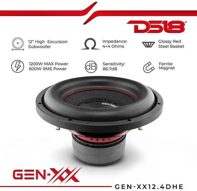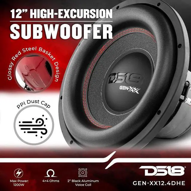 DS18 GEN-XX12.4DHE 12" High Excursion Car Subwoofer 1000 Watts Max Dual Voice Coil 4+4 Ohms (1 Speaker), Black