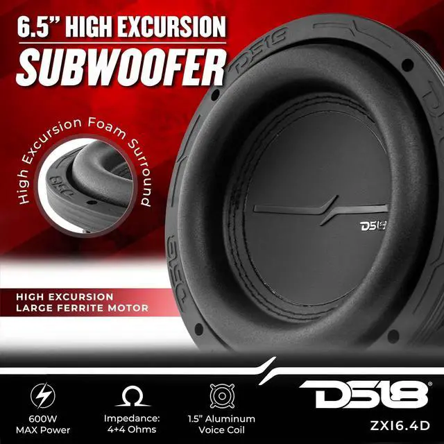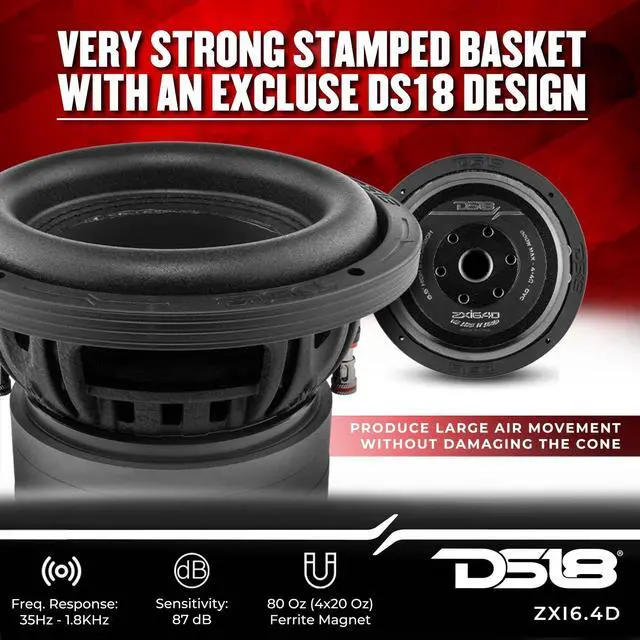 DS18 has the perfect subwoofer to satisfy all your bass head needs in the newly designed for the ZXI 6.4D high excursion subwoofer. This monster sub packs a 1.5 inch coil made to withstand high amounts of power with the utmost efficiency while producing thunderous distortion free bass. ^^ This sub has a low FS so it can be used in large boxes with lower than normal tuning. Not only will this subwoofer slay the lows, it is versatile enough to also play higher frequencies in the bass zone of sub frequencies. ^^ The ZXI subline is a great high excursion line of subwoofers that both handle great power and give you smooth clean bass while playing ultra low frequencies.