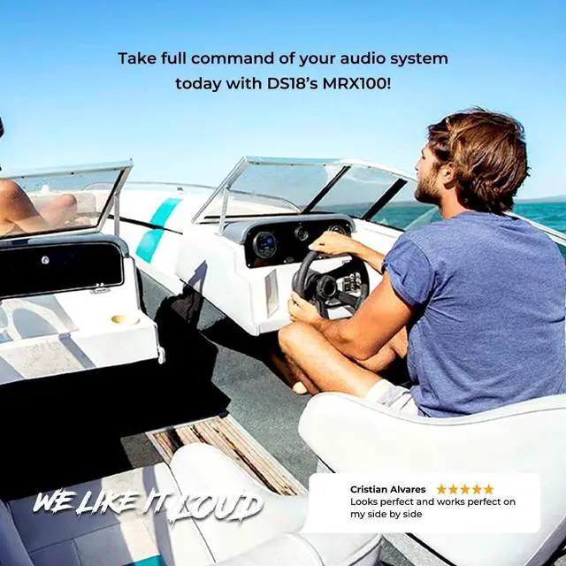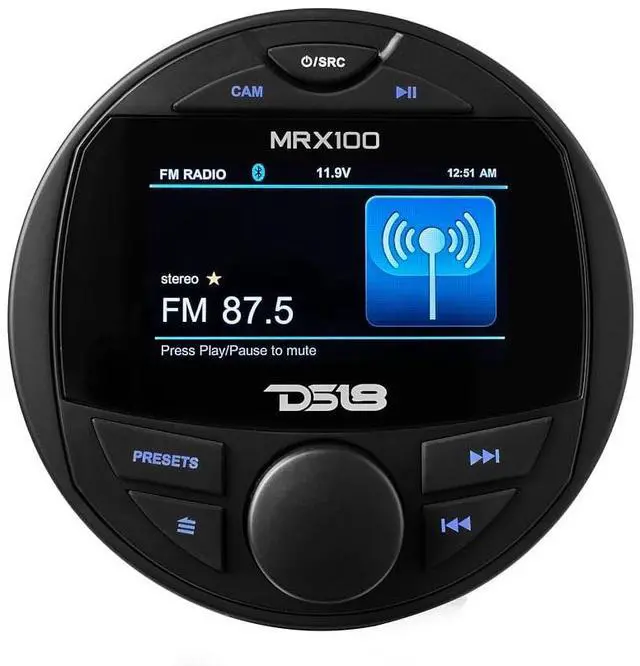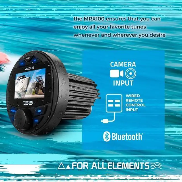DS18 MRX100 Marine Boat Head Unit - 2 Zones, 4 Volts Output, RDS 4X40 Watts, TFT Video Screen, No CD Player, Bluetooth Audio, IPX6 Rated, USB, MP3, AM/FM Radio Receiver ^^^^ DS18s MRX100 Marine Head Unit is designed to do it all and then some! ^^^^ The same beautiful compact design, upgraded to be even more powerful and durable to endure the toughest beating any marine, golf-cart, and off-road head unit will go through. ^^^^ The experts at DS18 upgraded this powerful receiver with: higher range Bluetooth connectivity, ^^^^ V5 Bluetooth pairing functions so you can play music direct from your phone or any BT source with a longer operating range. ^^^^ There is an easy to read LCD display with RGB keys so you can use the color that's easiest to read, to set your mood of the day, or color scheme!
