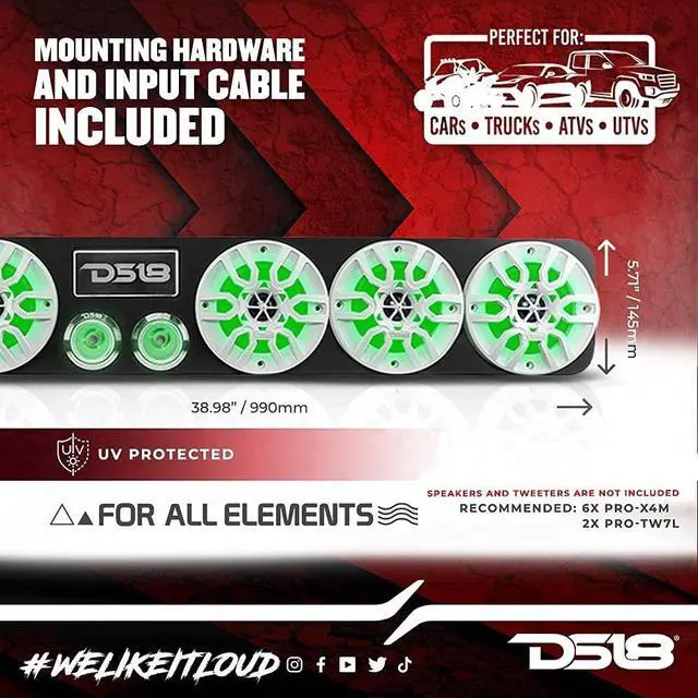 Audio enthusiasts are sometimes put in a position where they may not get the combination of speakers they are seeking because of the mounting limitations of their vehicle. We understand this and have developed a new sound bar pod that has universal mounting options. These bars can be installed with little to no fabrication needed and will allow you to add more speakers for better and louder sound. This sound bar houses six 4 inch speakers with two added tweeters and added RGB lighting in the DS18 logo badge. These will bolt right on to most applications to accommodate for a speakers where there were no factory options.