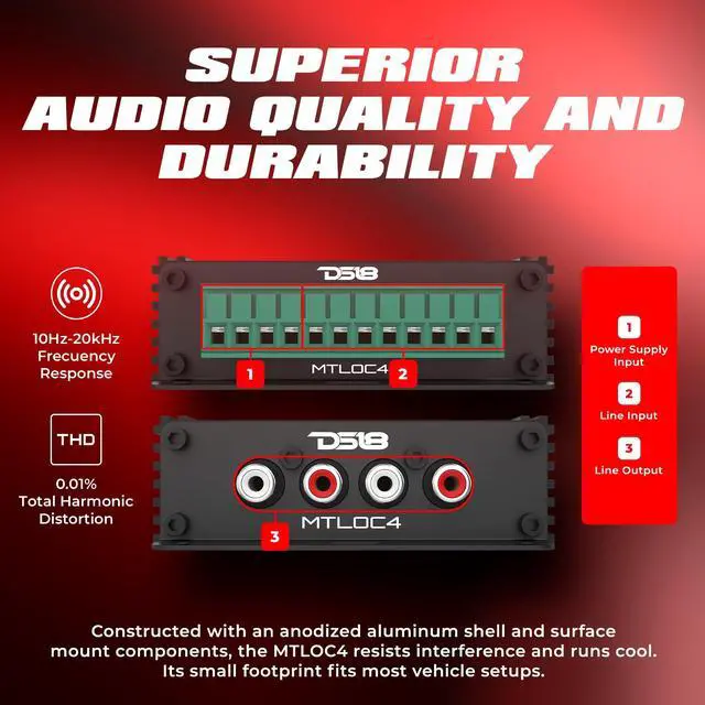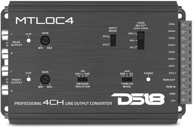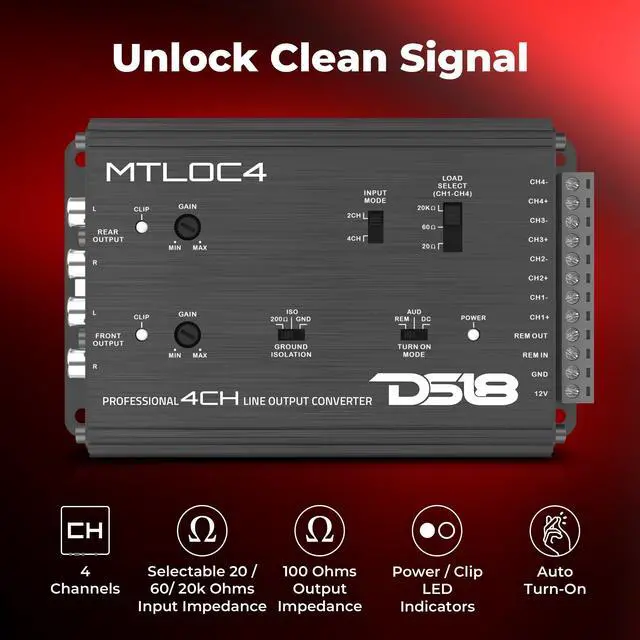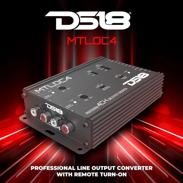 Expand Your Audio System The DS18 MTLOC4 converts four factory speaker-level outputs into four RCA outputs, making it easy to connect multiple amplifiers or upgrade complex OEM systems without signal loss ^^ Smart Auto Turn-On Technology Features automatic amp activation through Audio Sense, DC Offset, or Remote Trigger, simplifying installation and eliminating the need for extra wiring or switches ^^ Pure, Distortion-Free Sound With a wide 10Hz20kHz frequency response, less than 0.01 % THD, and over 110dB signal-to-noise ratio, the MTLOC4 delivers clean, accurate sound reproduction for professional-level audio quality ^^ Durable Aluminum Construction Built with anodized black aluminum housing and surface-mount components, this converter resists heat and interference for long-lasting reliability and consistent performance ^^ Universal Compatibility & Easy Setup Includes selectable 20 / 60 / 20k input impedance, ground isolation options, and a 14GA quick connector, making the MTLOC4 ideal for cars, trucks and motorcycles audio setups