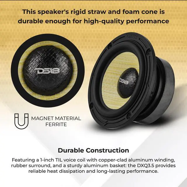CRISP & POWERFUL MIDRANGE SOUND Upgrade your car audio with the DXQ 3.5 3.5 midrange driver, engineered to deliver detailed vocals and smooth instrumentals. With a wide frequency response of 120Hz20kHz and 87dB sensitivity, enjoy distortion-free clarity even at higher volumes. ^^ HIGH-PERFORMANCE POWER HANDLING Built to handle serious sound, this speaker supports 60W RMS and 120W MAX power. Whether you're using a factory stereo or aftermarket amplifier, the DXQ 3.5 enhances your sound system with pro-level output and clean mids. ^^ DURABLE CONSTRUCTION FOR LONG LIFE Crafted with a lightweight yellow straw + composite foam cone, rubber edge surround, and black aluminum basket for durability and consistent performance.