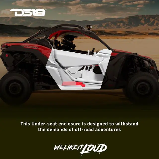 Intense Bass Kick for High-Performance Rides - Elevate your CAN-AM X3 experience with DS18s CA-X3BASS/D, delivering an intense bass kick designed specifically for high-performance rides. Compatible with X3 (2017-2023) ^^ Powerhouse Subwoofer - Equipped with DS18s PSW 12.4D, a powerhouse subwoofer boasting 600W RMS and 1200W MAX Power, providing exceptional bass reproduction in a shallow mount, perfect for tight spaces ^^ Durable Engineering for Resilient Sound - Crafted with a steel basket design and Integrated Sound Damping, ensuring exceptional resistance to shocks and vibrations, promising long-lasting, premium sound quality. Sealed Waterproof Under Seat Enclosure Design ^^ Effortlessly Compatible & Factory-Like Installation - Specifically designed for the CAN-AM X3, this under-seat enclosure seamlessly integrates with the driver side, ensuring a factory-fitted appearance and hassle-free setup utilizing original bolts and mounting points ^^ Immersive Audio Experience -