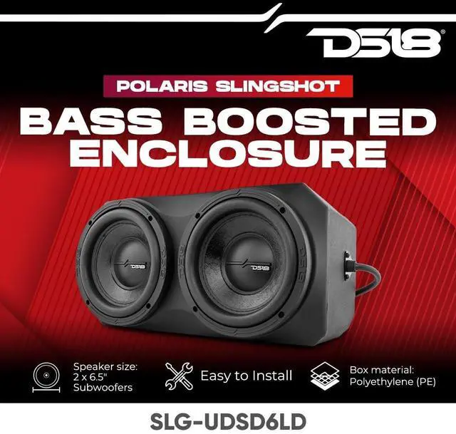 Say goodbye to lackluster bass and enjoy precise sound reproduction like never before ^^ Durable and Weather-Resistant - The SLG-UDSD6LD is specifically engineered for the challenges posed by the Polaris Slingshot's open-air design. Constructed from UV-resistant and waterproof plastic, this enclosure provides maximum protection against the elements, ensuring its longevity and top-notch performance ^^ Perfect Fit for Polaris Slingshot 2015+ - This enclosure is precisely designed to fit Polaris Slingshot models from 2015 and later, ensuring a seamless integration into your vehicle's sound system. Combined with the coated metal brackets for added resistance to the elements, this setup guarantees a lasting audio enhancement solution
