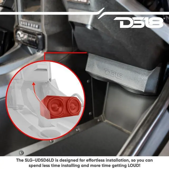 Powerful Bass Enhancement - Elevate your Polaris Slingshot's sound system to a whole new level with DS18's SLG-UDSD6LD. This easy-to-install enclosure comes loaded with two 6.5" ZR 6.4D subwoofers, capable of handling intense power and delivering punchy, clean bass you can truly feel ^^ High-Powered Performance - With a total RMS power handling of 600W and a maximum power handling of 1200W, the DS18 SLG-UDSD6LD delivers an impressive 90dB sensitivity, ensuring robust and clear bass reproduction within a wide frequency response range of 38Hz to 200Hz ^^ Precise Stereo Imaging - DS18's LOADED Under Dash Enclosure is designed to optimize stereo imaging, ensuring an immersive and dynamic audio experience for every passenger.