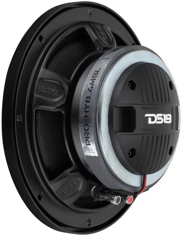 DS18 PRO-HY 8.4MSL 6.5" Mid-Range Shadow Slim Loudspeaker with Built-in Driver 400 Watts 4-OhmsYour search for the best high-powered audio speakers comes to an end with the DS18 Hybrid Speakers! SPECIFICATIONS Nominal Diameter 8" / 203.2 mmNominal Impedance 4 ohmsRMS Power Handling 200WMAX Power Handling 400WSensitivity (1w/1m) 94dBFrequency Response 100Hz - 20KhzRecommended HI Pass Crossover 120HzNumber of ways 2 waysPair or Single SingleGrill Included YesWOOFER SPECIFICATIONS Voice Coil Diameter 1.5" / 38.6 mmVoice Coil Former Material KSVWinding Material CCAWCone Material PaperSurround Material ClothBasket Material SteelBasket Color/Finish Glossy RedMagnet Material FerriteMagnet Weight 29.5 OzDRIVER SPECIFICATIONS Voice Coil Diameter 1" / 25.4 mmVoice Coil Former Material KaptonWinding Material CCAWDiaphragm Material TitaniumMagnet Material NeodymiumHorn Diameter 3" / 76.2 mmSPEAKER MEASUREMENT Overall Diameter 8.62" / 219mmOverall Depth 4" / 102.5 mmFront Mount Baffle Cutout 7.12" / 181mmMounting Depth 3.11" / 79mmMotor Diameter 5.27" / 134mm