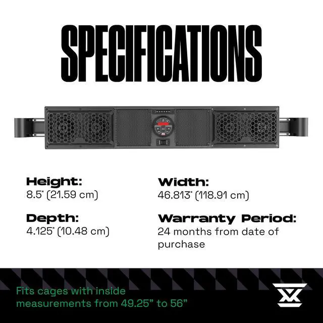 height: 8.5", depth: 4.125", width: 46.813". Installation may reduce headroom, especially for riders wearing helmets. Works with most Bluetooth-enabled devices. Pairing may be required with each power cycle, depending on Bluetooth hardware and software. Backed by a 24-month warranty from the date of purchase. Enhance your off-road experiences with the MTX Overhead Bluetooth UTV Sound Systemwhere superior sound meets rugged adventure.