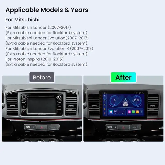 Applicable Models & YearsFor MITSUBISHI Lancer / Evolution / Evolution X (2007-2017) (Extra cable needed for Rockford system), For Proton Inspira (2010-2015) (Extra cable needed for Rockford system)