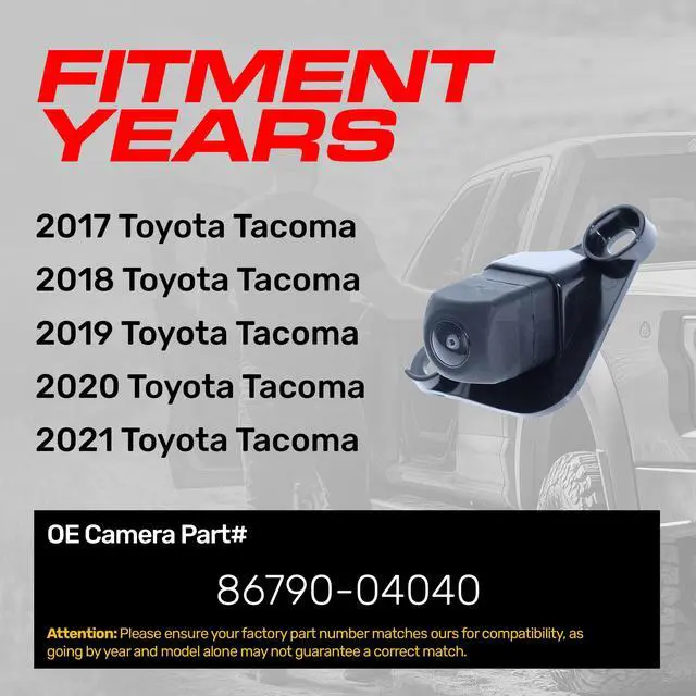 **ATTENTION: Before purchasing, make sure to verify that your part number is an EXACT MATCH to this part number* ^^ [For use with]: Toyota Tacoma (2017 2018 2019 2020 2021) OE Part # 86790-04040 (8679004040) ^^ [Camera]: Wide angles up to 168 (Diagonal) + 100 (Vertical) + 136 (Horizontal); Designed for low light to. 1lux ^^ [Specs] Up to 800TVL; Waterproof to IP69K; Safe working temp from -104F to 220F. Japanese Nidec Lens, OnSemi USA Chip ^^ [Plug and