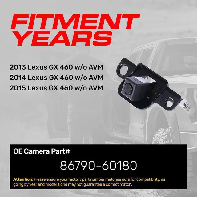 **ATTENTION: Before purchasing, make sure to verify that your part number is an EXACT MATCH to this part number* ^^ [For use with]: Lexus GX 460 w/o AVM (2013 2014 2015) OE Part # 86790-60180 (8679060180) ^^ [Camera]: Wide angles up to 168 (Diagonal) + 100 (Vertical) + 136 (Horizontal); Designed for low light to. 1lux ^^ [Specs] Up to 800TVL; Waterproof to IP69K; Safe working temp from -104F to 220F. Japanese Nidec Lens, OnSemi USA Chip ^^ [Plug and
