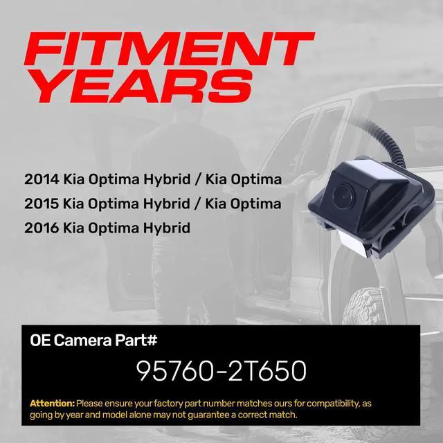 **ATTENTION: Before purchasing, make sure to verify that your part number is an EXACT MATCH to this part number* ^^ [For use with]: Kia Optima (2014 2015), Optima Hybrid (2014 2015 2016) OE Part # 95760-2T650 (957602T650) ^^ [Camera]: Wide angles up to 168 (Diagonal) + 100 (Vertical) + 136 (Horizontal); Designed for low light to. 1lux ^^ [Specs] Up to 800TVL; Waterproof to IP69K; Safe working temp from -104F to 220F. Japanese Nidec Lens, OnSemi USA Chip ^^ [Plug and
