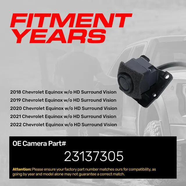 **ATTENTION: Before purchasing, make sure to verify that your part number is an EXACT MATCH to this part number* ^^ [For use with]: Chevrolet Equinox w/o HD Surround Vision (2018 2019 2020 2021 2022) OE Part # 23137305 ^^ [Camera]: Wide angles up to 168 (Diagonal) + 100 (Vertical) + 136 (Horizontal); Designed for low light to. 1lux ^^ [Specs] Up to 800TVL; Waterproof to IP69K; Safe working temp from -104F to 220F. Japanese Nidec Lens, OnSemi USA Chip ^^ [Plug and