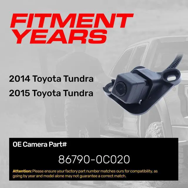 **ATTENTION: Before purchasing, make sure to verify that your part number is an EXACT MATCH to this part number* ^^ [For use with]: Toyota Tundra (2014 2015) OE Part # 86790-0C020 ^^ [Camera]: Wide angles up to 168 (Diagonal) + 100 (Vertical) + 136 (Horizontal); Designed for low light to. 1lux ^^ [Specs] Up to 800TVL; Waterproof to IP69K; Safe working temp from -104F to 220F. Japanese Nidec Lens, OnSemi USA Chip ^^ [Plug and