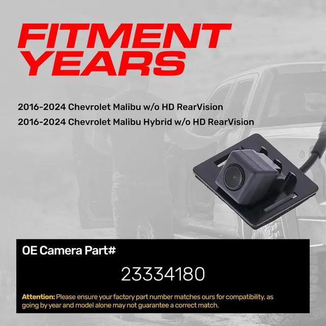 **ATTENTION: Before purchasing, make sure to verify that your part number is an EXACT MATCH to this part number* ^^ [For use with]: Chevrolet Malibu, Malibu Hybrid (2016 2017 2018 2019 2020 2021 2022 2023 2024) w/o HD RearVision OE Part # 23334180 ^^ [Camera]: Wide angles up to 168 (Diagonal) + 100 (Vertical) + 136 (Horizontal); Designed for low light to. 1lux ^^ [Specs] Up to 800TVL; Waterproof to IP69K; Safe working temp from -104F to 220F. Japanese Nidec Lens, OnSemi USA Chip ^^ [Plug and