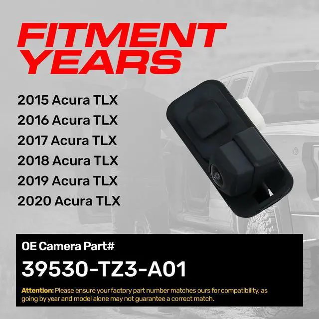 **ATTENTION: Before purchasing, make sure to verify that your part number is an EXACT MATCH to this part number* ^^ [For use with]: Acura TLX (2015 2016 2017 2018 2019 2020) OE Part # 39530-TZ3-A01 (39530TZ3A01) ^^ [Camera]: Wide angles up to 168 (Diagonal) + 100 (Vertical) + 136 (Horizontal); Designed for low light to. 1lux ^^ [Specs] Up to 800TVL; Waterproof to IP69K; Safe working temp from -104F to 220F. Japanese Nidec Lens, OnSemi USA Chip ^^ [Plug and