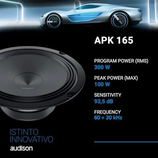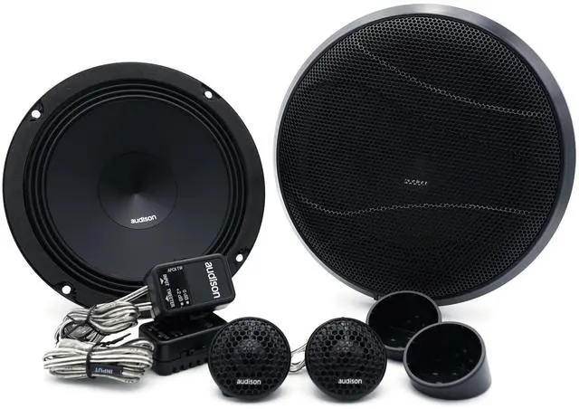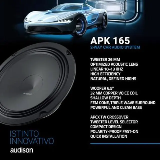 APK 165 - KIT 2Way AP 1+AP 6.5 +Grilles Two way system features AP 1 tweeter and AP 6.5 woofer. APCX TW crossover features a two-position level selector providing the ability to adapt its response to its two main applications: +2dB if installed behind the OEM grille, 0dB for an A-pillar installation without additional grilles between the tweeter and the listener. To ease the installation in OEM placements the woofers are equipped with high current fast-on terminals with double contact on positive and negative poles for high flexibility and quick connection. Features - AP 1 tweeter with 26 mm diameter diaphragm combined with a wide-roll surround provides maximum efficiency and reduced resonance frequency. AP 1 tweeter with acoustic lens designed to compensate for and fine tune the in-car frequency response anomalies in the 10kHz - 13kHz bandwidth caused by restrictive OEM grilles in critical OEM placements. APCX TW very compact tweeter passive crossover optimised for OEM Integration featuring an attenuation switch (0 dB, +2dB) to tune the in-car response according to different installation conditions. Passive crossovers are supplied with OEM Integration compliant fast-on connectors. The ends, different in each of the two poles, eliminate any possible connection errors and speed up the required installation time. AP 6.5 woofer with 32 mm pure copper voice coil, for high power handling and outstanding low frequency control. AP 6.5 woofer with water-repellent treated paper cone, featuring a profile developed with FEM (Finite Element Method) simulation technology and optimized with the Klippel R&D Scan Vibrometer.