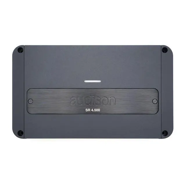 SR 4.500. 2 - 4 CHANNEL AMPLIFIER 4x125W. We are proud to present the renovated SR 4.500 (130 W x 4 @ 4) introduced back in 1988 and constantly updated with the best technologies available. After numerous listening tests in a double-blind configuration on a significant sample of professionals and enthusiasts, the R&D team decided to adopt a new D-class technology called ADT (Audison D-Class Technology) for the whole range, which made it possible to reduce the size of the amplifiers considerably, totally preserving the audio performance that characterize each Audison project. As for the electronics design, the Audison style center has taken care of every aesthetic and functional detail, obtaining a compact amplifier made of extruded aluminium with rounded corners that ease the installation of the product in narrow spaces.