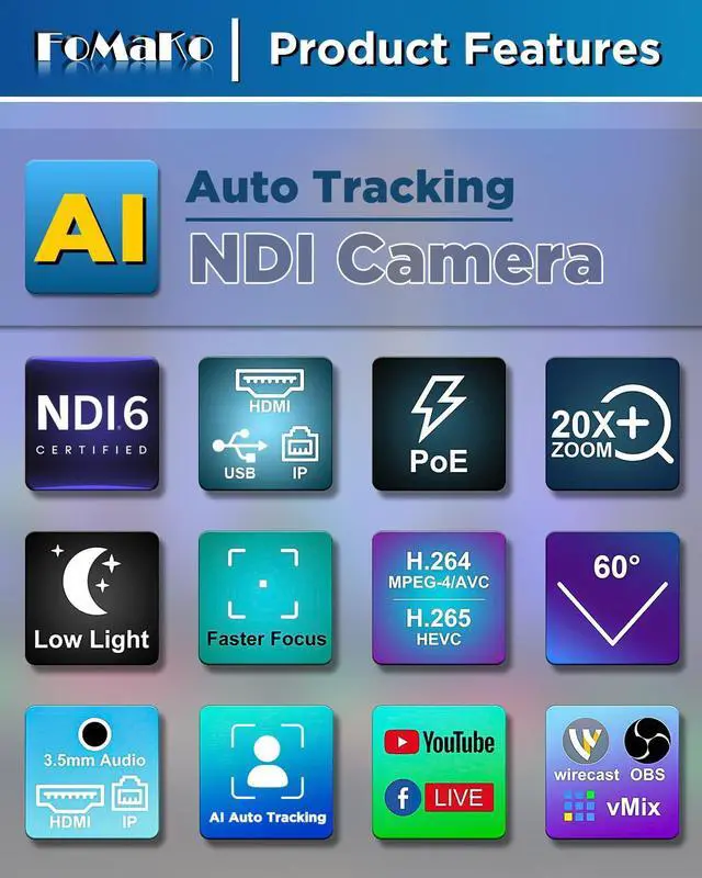 FoMaKo NDI Camera . AI Auto Tracking PTZ Camera, HDMI PTZ Camera, support Full 1080P all video output up to 60fps, ture to life colors, a budget HDMI PTZ Camera and made for Church live service, School, Live Streaming, Broadcast, Hospital, Wedding, and house of worship. PoE supported.